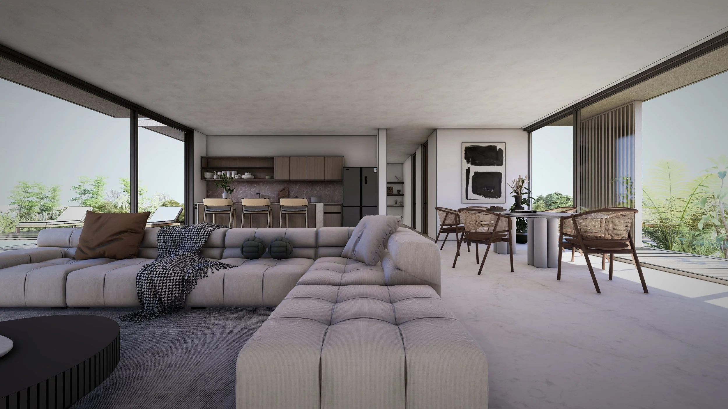 THE PALETTE IS TONAL, TACTILE AND TIMELESS: WARM WOOD, WOVEN CANE, TEXTURED FABRIC AND STONE LIKE FLOORING. THESE ELEMENTS ARE NOT DECORATIVE BUT ATMOSPHERIC TOOLS, CURATED TO EVOKE A COASTAL CALM ECHO OF THE EARTH AND VEGETATION JUST BEYOND THE GLASS.